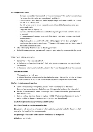 These notes contain the ten main topics for this unit: 1) Introduction 2) Damages for personal injury 3) Damages and Death 4) Particular negligence situations: Psychiatric injury 5) Particular negligence situations: Liability of Statutory and Highway Authorities 6) Liabilities for Animals 7) Breach of Statutory Duty 8) Trespass to the person 9) Trespass to land 10) Private Nuisance