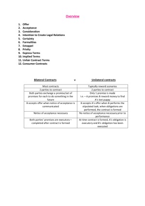 Condensed comprehensive notes for LAW2101 (Contract A) as taught in Semester 1 of 2016. Covers: 1. Offer 2. Acceptance 3. Consideration 4. Intention'to'Create'Legal'Relations 5. Certainty 6. Formalities 7. Estoppel 8. Privity 9. Express'Terms 10. Implied'Terms 11. Unfair'Contract'Terms 12. Consumer'Contracts'