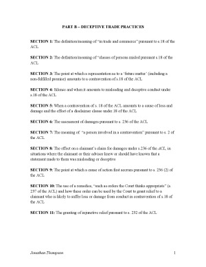 PART B: DECEPTIVE TRADE PRACTICES - These notes are a succinct summary of Geoff Moore's book, answering deceptive trade practices questions in bullet point format (this allowed for greater flexibility in the final exam and improved time management). - The pre-prepared answers cover all topics, content and cases. - THESE NOTES INCLUDES BOTH CASE SUMMARIES AND ANSWERS (see sample). - Print these notes off and thats all you will need for the exam! - Achieved High Distinction (85).