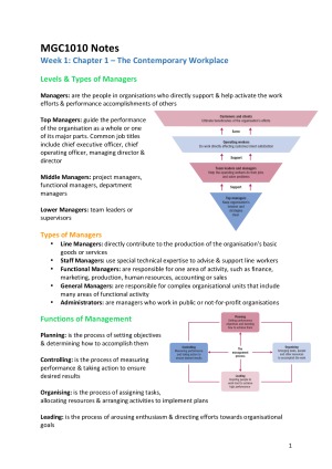 Great summary notes for MGC1010 exam and entire course included. Easy to follow as subjects are in week by week format.