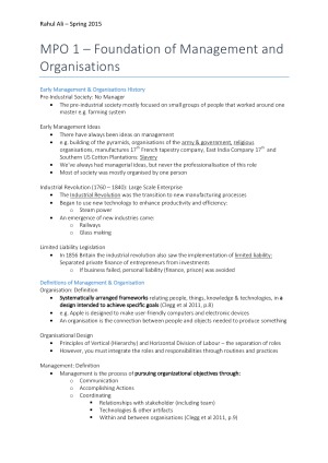 Hey all! Thought it was time to let these go and help you succeed! These are my notes on which I received a mark of 82 as my final. They do not include the final two chapters. These notes include: Foundations of Management and Organisations, Power Resistance and Post-Bureaucracy, Managing Culture, Leadership, HR Management, Managing Individuals, Managing Teams and Groups, Managing Sustainability, Managing Globalisation, Managing Communications Does not include: Innovation, Knowledge