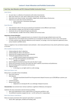 This note is heavily based on the lecture slides and the lecture recordings. It has been structured in a way that is easy to understand. Topics covered include: - Asset Allocation and Portfolio Construction - Managed Funds, Selection and Strategy - Home Ownership and Credit - Superannuation - Insurance - Social Security, Estate Planning and Family Breakdown