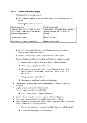 A comprehensive note on all lecture and tutorial contents for the final exam (covers weeks 1-12). Neatly organised in weekly order. Compiled by a HD student (89%)- awarded the Faculty of Arts Highest Achiever in Unit Award for ENVG/GEOP350.