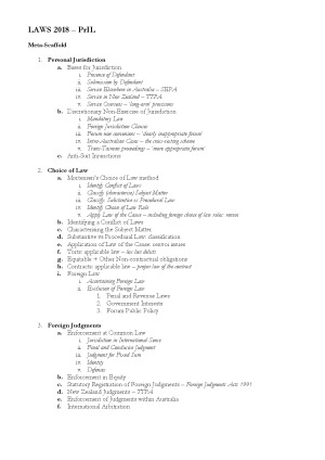 High quality, content dense and common sense Private International Law notes. I like to use a straight forward, short sentence style of writing in notes that explains difficult concepts in a quickly and easily understood manner. My notes are generally structured in a scaffold format with content organised under key questions in each section that follow a logical order for answering problem questions. The 'meta-scaffold' on the front page sample shows this style. Topics covered: 1. Introduction 2. Personal Jurisdiction 3. Choice of Law 4. Foreign Judgments Note: the sample is the first page of each of the 4 sections or topics of the notes just to give you a feel for what they're like. Enjoy!