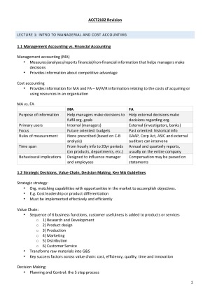 Complete compilation of notes for Mid-Semester and Final exams for ACCT2102 (with diagrams and required journal entries). No notes for Lecture 5 Activity Based Costing as this is tested through assessment.