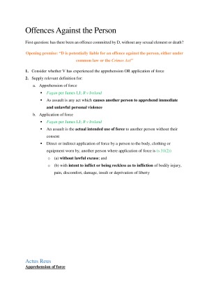 These are my notes for crim 1. They're all really workable for exams. Divided up into types of crime and how to approach a rape, murder, homicide etc. type question. Each stage in the problem map has a citation for the relevant authority - which is colour coded. Each stage also has a good opening line that you can apply to the problem. There are also a few broad notes about the relevant policy/conceptual points in the course. Green = case/legislation authority Purple = secondary source authority (textbook, author, article, extra-curial judge) Pink = case/legislation/secondary source that wasn’t on reading guide (case mentioned in a case/mentioned in lecture etc.)