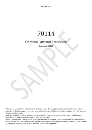 These are a comprehensive set of notes on the entire course. They may be used as a point of reference in class, especially to clarify concepts or when you need to find that extra detail about the element of a crime quick for those class participation marks. I have also included an ‘Exam’ section, which includes a far more concise version of the notes. I would suggest printing them 2 pages to a side on paper to bring into the exam. Includes: Topic 1: Introducing Concepts of Criminal Justice and Bias; Court Visits Topic 2: Crime, Punishment and Prosecution Topic 3: General Principles: Proof; Conduct and Fault Elements Topic 4: Assault and Sexual Assault Topic 5: Property Offences Topic 6: Unlawful Homicide: Murder and Manslaughter Topic 7: Participation in Crimes Topic 8: Defences Topic 9: Criminal Procedure Topic 10: Exam Revision