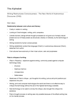 I received the Faculty of Arts Highest Achiever in a Unit of Study Award for this unit. Notes cover several readings discussed throughout the semester. These notes helped break down the readings for online quizzes and assessments. Contains: - Writing Restructures Consciousness - The New World of Autonomous Discourse (ONG) - The Future of Newspapers - Historical Perspectives (Martin Conboy and John Steel) - Technology and ideology - The case of the Telegraph (Carey) - Repeated Takes - A short history of Recording and its Effects on Music (Michael Chanan) - The media and modernity (John Thompson) - Radio’s Lessons for the Internet (Eszte Hargittai) - The Language of New Media (Lev Manovich) - Electronic Enlightenment or the Digital Dark Age? Anticipating Film in an Age without Film (Leo Enticknap) - Hacker Ethic (Steven Levy) - Always-On/Always-On-You: The Tethered Self (Sherry Turkle) - Introduction: what do you mean ‘cell phone culture’?! (Gerard Goggin)