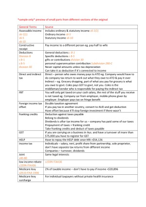Midsemester notes (topics 1-4) Notes gathered from lectures, tutorials, study notes, textbook and other course readings Includes definitions, cases, section numbers in legislation and calculations in alphabetical order as recommended by the lecturer to easily find what you're looking for in exams