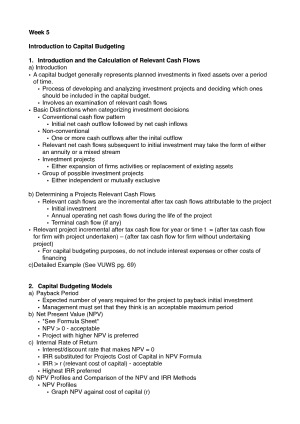 Final Exam notes for CFM. Includes all topics from second half of the semester Included topics - Introduction to Capital Budgeting - Capital Budgeting Continued - Costs of Capital - Leasing and Options - Dividend Policy - Leverage and Capital Structure - Mergers and Acquisitions