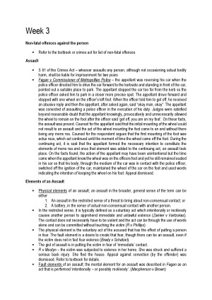 Criminal Law notes for final exam (week 3 onwards). Includes topics - Non-fatal offences against the person - Sexual Offences - Murder - Involuntary Manslaughter - Voluntary Manslaughter - Insanity, voluntariness, automatism & intoxication - Stealing & other property offences - Attempt, Conspiracy & Complicity