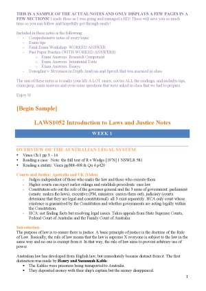 Comprehensive notes for Introducing Law and Justice (ILJ). I made these as I was going and managed to receive a HD! The aim of these notes is to make your life A LOT easier, covers ALL the readings and topics, and includes tips, exam prep, exam answers and even some questions that were asked in class that we had to prepare. Forget hundreds of pages of readings! Included in these notes is the following: - Comprehensive notes of every topic - Exam tips - Final Exam Workshop: WORKED ANSWER - Past Paper Practice (WITH WORKED ANSWERS): o Exam Answers: Research Component o Exam Answers: Intentional Torts o Exam Answers: Essays - Donoghue v Stevenson in Depth Analysis and Speech that was assessed in class This is all that you will need to breeze through ILJ. Enjoy!