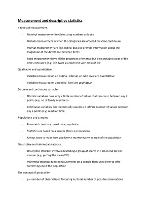 These study notes cover the theoretical and mathematical content needed for the final exam. When and how to use each statistical procedure as well as the visual formula is included (there is also a brief symbol glossary) I have included my notes for the methodology part of the final exam.