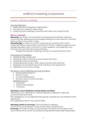 These notes are a comprehensive summary of: - McGraw Hill Campus Marketing eBook textbook notes (chapters 1 - 13) - Lecture slides - Lecturer Hints - Tutorial Tips/Information