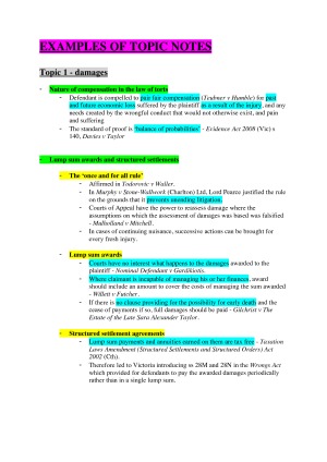 **THE SAMPLE CONTAINS EXAMPLES FROM THE ENTIRETY OF THE NOTES SO YOU CAN SEE WHAT THEY'RE SET OUT LIKE AND IF THEY WILL WORK FOR YOU :)** These notes are made from a combination of all the readings, the lecture slides and the notes provided on the Cloud. They are absolutely comprehensive and include everything you need. Having these will save you seriously so much time. Also, most importantly, I have made my own question guide for all examinable topics (topic 1, topic 4: vicarious liablity and topics 5-12 inclusive). They are detailed and will allow to quickly write your exam answers without being lost about what to write. They are a reflection of what I have in my notes but will save you time going through pages and pages of notes. My notes are also colour-coded, which will allow you to skim the notes easily and see any relevant parts. I know from other notes advertised on here that some are wayyyyy too long and can really not assist you much in a practical exam-type situation where you have to quickly read information and apply it. That's why my notes are relatively succinct and contain the question guide. I hope you do well in this subject and that my notes help! Good luck!