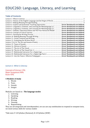 These are extremely detailed and comprehensive notes I took as I watched all the lectures. They are highly organised and will no doubt be a great help to your study! (Have not yet received mark for this subject) Please disregard the "Error bookmark not defined" in the preview. It will not show up in the actual document.