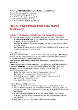 Highly detailed notes covering the entire course of Mind, Brain and Behaviour 2. I have incorporated key points that the lecturers have said during the lectures, into the notes. Furthermore, I have bolded significant points that are likely to come up on the exam. The notes contain an extensive research methods section, with helpful worked examples, key definitions of research method concepts, and diagrams. Key diagrams are also included throughout notes, where relevant. The notes cover the entirety of the course: 1) Human Development 2) Social Psychology 3) Personality Psychology 4) Clinical Psychology 5) Quantitative Methods