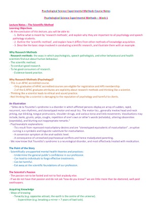 Course notes from the entire semester of BEHV2000 Psychological Science Experimental Methods. Includes notes from lectures and tutorials, organised by week. Are 'colour-blocked' for ease of reading and studying. Received high distinctions on all assessments and an overall mark of 91% in this unit.