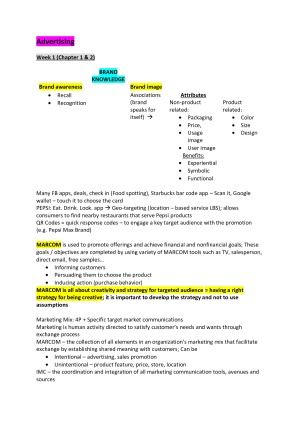 Summary of Advertising subject - well structured, easy to learn, understand and revise. Includes both materials from lectures and the revision of the relevant chapters of the prescribed book (pictures + tables + examples + case study).