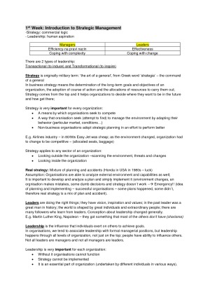Summary of Leading for Strategic Advantage subject - well structured, easy to learn, understand and revise. Includes both materials from lectures and the revision of the relevant chapters of the books (pictures + tables + examples + case study).
