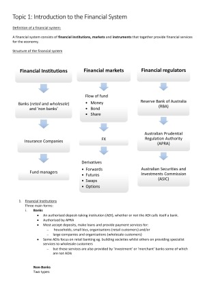 These notes are for the whole course based on the prescribed textbook, Financial Institutions & Markets, as well as additional information from lecture slides. They are thorough and concise summaries of topics 1-10 and provides many examples. These notes are perfect if you are time poor to make your own notes but want to obtain a HD.