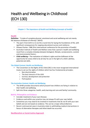 HIGH DISTINCTION ECH130 HEALTH AND WELLBEING IN EARLY CHILDHOOD NOTES