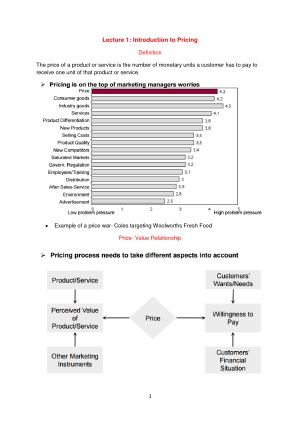Extensive Pricing Strategies and Tactics notes compiled from both the textbook and lecture slides that allowed me to get a HD in this subject. Topics covered within these notes include: - Introduction to Pricing - Strategy and Price Positioning - Psychology of Pricing - Economy I - Economy II - One Dimensional Prices - Multi-Dimensional Pricing Strategies I - Multi-Dimensional Pricing Strategies II - Multi-Dimensional Pricing Strategies III - Long Term Price Optimisation - Price Implementation, Ethics and Law