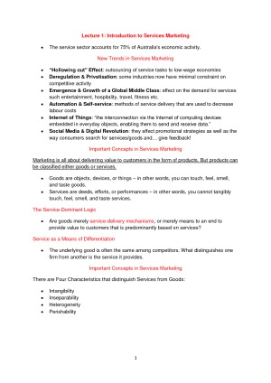Extensive Services Marketing notes compiled from both the textbook and lecture slides that allowed me to get a HD in this subject. Topics covered within these notes include: - Introduction to Services Marketing - Consumer Decision Making Process and Employees - Managing the Physical Evidence and Blueprinting - Pricing - Setting Standards - Service Failure and Recovery - Retaining Customers - Customer Service - International and Ethnic Services Marketing - The Communications Mix and Digital Marketing - Services Branding