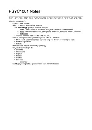 Comprehensive and concise PSYC1001 notes that include ALL examinable material (lecture materials supplemented by tutorial and reading materials). Written in dot point format for easy reading. Topics covered include: History (And Philosophical Foundations) of Psychology, Emotion, Science and Statistics, Social Psychology, Personality and Child Development I achieved a final mark of 87 (high distinction).