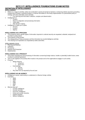 SCY1117 Intelligence Foundations Exam Notes Includes overview of each topic. Topics include: 1. Definition of Intelligence; 2. Intelligence Cycle; 3. Intelligence Analysts; 4. Intelligence Collection; 5. Intelligence Legislation; 6. Universe of Data; 7. Intelligence Products; 8. Intelligence Failure; 9. Intelligence Community; and 10. Intelligence/Security/Privacy. Content as at Semester 1, 2017.