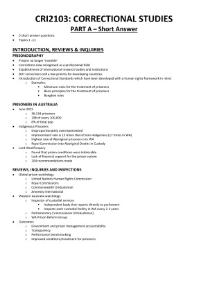 CRI2103: Correctional Studies - Theory and Practice Exam Notes Includes an overview of each topic. Topics include: 1. Introduction, Reviews & Inquiries; 2. Philosophies and Concepts of Imprisonment; 3. Crisis in Prisons; 4. International Focus on Prisons; 5. Prison Security, Grooming and Radicalisation; 6. Current Challenges in Prisoner Management; 7. Minorities, At Risk and Vulnerable Prisoners; 8. Private Prisons 9. Woman & Youth in Custody; 10. Working in Prisons; and 11. Prison Design, Architecture and Technology. Content as at Semester 2, 2016.