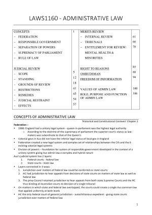 Complete and detailed set of notes covering all topics in Admin Law - LAWS1160 using the brand new syllabus and textbook - Extensively researched and everything you need. Includes all topics as well as summaries and references to the textbooks, legislation, case law and scholarly articles.
