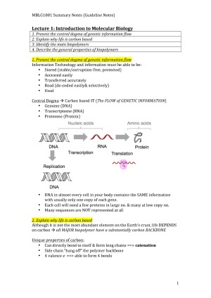 This is my lecture summary notes for MBLG1001/1901: - Cover the first 15 lectures in details - Concise summary of lecture material arranged under colour coded learning objectives - Essential knowledge only, no extra BS Sample is of the first 2 lectures