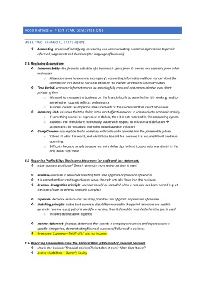 Selling HD notes for Accounting A. Information gathered from textbook, lecture notes, tutorial notes and other sources. Includes notes from all lectures/ weeks. Topics: 1/2. Financial Statements 3. Recording accounting transactions 4. Accrual accounting and adjusting entries 5. Cash and internal controls 6. Receivables 7. Inventory and retail operations 8. Intro to management accounting and costing 9. Cost volume profit analysis 10. Budgeting & Activity Based Costing 11. Relevant costing & Long- term decision making 12. Integrating accounting concepts