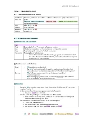 The notes consist of the lecture slides, textbook and other readings, and case summaries. The notes are formatted for exam use with tables and clear, easy to follow structure. Mens Rea and Actus Reus elements, defences, the Crimes Act, the Juries Act, and cases are all colour coded. This makes them easy to find when working under pressure. The notes cover all topics: introduction, public interest vs individual liberties, sentencing, elements of a crime, non-fatal/non-sexual offences against the person, sexual offences, homicide, and defences.