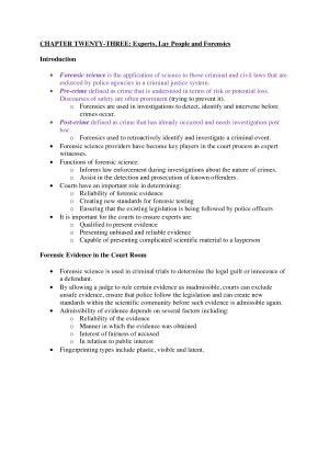 Notes were created utilising both textbook and lecture slides/notes. Topics include: - Criminal Justice System Aims and Purposes - Police and Policing - Privatisation in the Criminal Justice System - Imprisonment and Detention - Innovative Justice Processes - Crime Prevention and Reduction - Victims and Criminal Justice - Experts, Lay People and Forensics - Failures of Justice - Remedies for Miscarriages of Justice - Justice and Human Rights