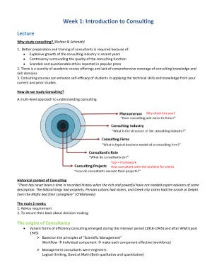 This is a summary of Consulting Fundamental week 1-12! All essential materials that you need to prepare for your exam are all here including all cases and the missing answers from the classes! This material is perfect for the open-book exam that you can search all answers that you want Go grab one and be confident for your final exam! There is no week 5 as it was presentation week. Contains: Week 1: Introduction to Consulting Week2: Theoretical and Empirical Perspective of Consulting Week 3: Consulting Operating Models & Engagement Lifecycles Week 4: Managing Client-Consultant Relationship Week 6: Structured Problem Solving Week 7: Structured Communication Week 8: Managing Change as Consultants Week 9: Strategy Consulting Week 10: Operations Consulting Week 11: Career Management in Consulting Week 12: Professional Issues and Ethics