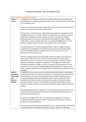 A summary table of REAL LIFE EXAMPLES for Introduction to Management HD 87%