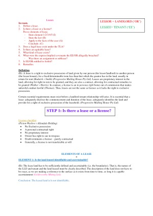 These notes cover the following topics: Mortgages; Easements; Leases; The Residential Tenancies Act; and Restrictive Covenants The format of these notes are in a way that it is easy to follow and aids at guiding you to answer the exam questions. included is exactly what you need to write in the exam using the IRAC method of problem solving and also, a little summary for each topic listing off the steps needed and what is needed to be included to help you keep track of it all. Also, I have included how you would answer a mortgages problem question (if one came up). All you would need to do is to copy and paste in the exam what is written down in the practice answer and relate it back to the relevant facts of the exam problem.
