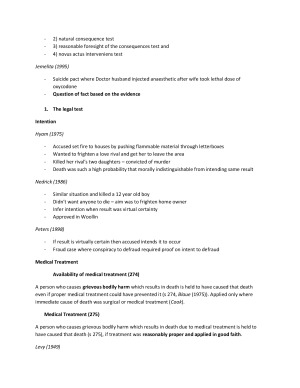 LAWS4102 Criminal Law Exam Notes Criminal Law in Western Australia Details the steps to each offence with reference to relevant case law. Offences: - Fatal Offences Homicide (s 270) Deeming Provisions Murder (279(1)(a)(b)) Dangerous Act Murder (279(1)(c)) Manslaughter (s280) Road Traffic Act Unlawful Assault Causing Death (s 281) Attempted Murder (s 283) Procuring Suicide (s 288) Abortion (s 199) Preventing Birth of Live Child (s 290) Death by Acts Done at Childbirth (s 271) - Non- Fatal Offences Common Assault (313) Assault Occasioning Bodily Harm (317) Acts or omissions causing bodily harm or danger (304) Serious Assault (318(1)(d)(f)) Assault with Intent (317(a)) Causing Grievous Bodily Harm (297) Grievous Bodily Harm (1) Grievous Bodily Harm or Wounding with Intent (294) Wounding (301(1)) Stalking (338(e)) Threats (338) - Sexual Offences Sexual penetration without consent (325) Sexual Penetration (319(1)) Sexual Coercion (327) Indecent Assault (323) Sexual Offences Against Child (320 – 322) Sexual Offences Against Incapable Person (330) Sexual Servitude (331B) Conducting business involving sexual servitude (331C) Deceptive recruiting for commercial sexual service (331 D) - Property Offences Stealing (371) Robbery (392) Assault with Intent to Rob (393) Burglary (401) Fraud (409) Extortion (397 (1) (2)) Damage to Property (444)