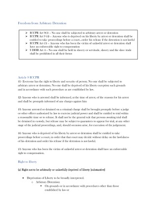 These notes feature three and a half (3.5) pages of number contents to quickly and easily find what you're searching for in an exam. Topics include: UNDHR and Bill of Rights, Right to Life, Freedom from Torture, Cruel, Inhuman and Degrading Treatment, Freedom of Speech, Right to Private Life, Fair Trial, Equality before the Law, Non-Discrimination, Protection of Minorities, UN Human Rights System, UN Human Rights Council, UN Human Rights Treaty Body, Rights of Children, Rights of Refugees and Counter Terrorism Law. Notes contain both international and domestic sources of law as well as key cases. Notes also contain key articles for each system of law at the start of each topic.
