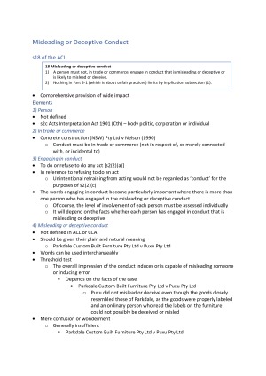 Complete Mid Semester Exam Notes. Notes taken from textbook readings as well lecture materials. Includes the topics: - Misleading or Deceptive Conduct - Specific False or Misleading Representations - Specific Unfair Practices - Manufacturers Liability - Remedies