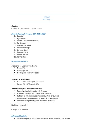 These are summary notes of the two workshops / seminars in this unit. They include detailed explanations of the statistical tests covered in the unit. Relevant diagrams and equations with clear explanations are included, making it easy to follow and understand. The suggested readings for these workshops (from the SPSS book) are also included. Will be very helpful for the 3 lab / stats quizes in the unit.