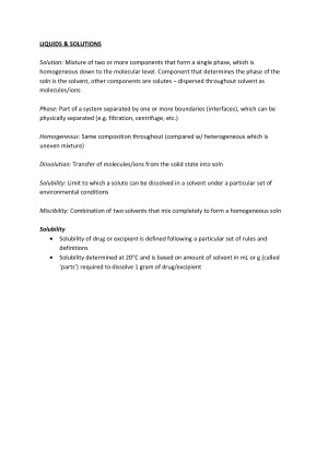 These notes include everything you need for the course in a concise and detailed manner. They also include tips for the exam throughout. I was able to receive a High Distinction using my notes. Each topic is in detail, with a summary at the end of each. These notes contain the following topics: - Liquids and Solutions - Crystalline and Amorphous Materials - Rheology - Suspensions - Emulsions - Freezing Point depression - Parenteral Products - Skin and Ears - Nose and Eyes - Liquid Formulations - Aerosols - Protein Formulations - Herbal Medicines