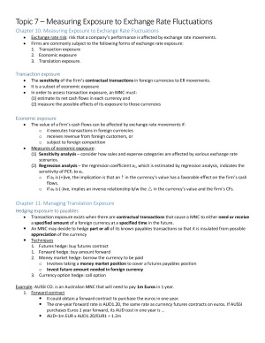 These notes are for the whole course based on the prescribed textbook, International Financial Management (Jeff Madura 12th edition), as well as additional information from lecture slides and readings etc. They are thorough and concise summaries of topics 1-10 (excluding topic 9) and provides many examples. Topic 9 on Multinational Capital Budgeting has been excluded as the topic is based on numerical examples provided in lecture and textbook. These notes are perfect if you are time poor to make your own notes but want to obtain a HD.