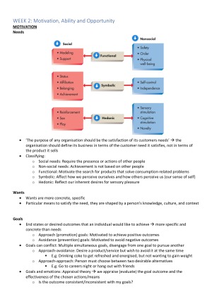 Concise and organised revision notes I used for MKF2111 exam that covered every topic that was examined in detail. Helped me get 90+% on the final exam. Includes coloured diagrams. Topics covered in notes (all weeks): - Motivation, ability, opportunity - Exposure, attention, perception - Knowledge and memory - Attitudes - Decision-making process - Consumer culture - Innovation and ethics