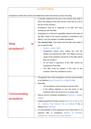 Well structured, colour-coded, easy to follow contract law exam notes. Provides a structure and scaffold for answering exam questions. Gives a comprehensive overview of contract law. These notes make the exam so much easier by breaking down the law into elements and providing authorities. Table of Contents: • Definitions and Terms • Offer • Acceptance • Consideration • Intention • Certainty and Completeness • Promissory Estoppel • Capacity • Privity • Formalities • Illegality o Statutory Illegality o Public Policy Illegality • Restraints of Trade • Consequences of Illegality • Terms o Express Terms o Notice Requirements in Various Contexts o Extrinsic Evidence o Implied Terms o Construction / Classification o Exclusion Clauses • Misrepresentation o Types of Misrepresentation • Mistake o Common Mistake o Mutual Mistake o Unilateral Mistake • Duress • Undue Influence • Unconscionability • Third Party Impropriety • Termination o Termination by Performance o Termination by Agreement • Breach and Repudiation o Breach o Actual Breach o Repudiation • Frustration • Remedies Colour code: Red - element Green - legislation Blue - case law