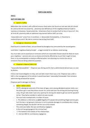 Extensive and detailed Semester 1 notes, all key cases summarised and synthesized with the main textbook. Includes topic checklist and key points at the end of each topic: Duty of Care, Breach of duty of care, Factual Causation, Scope of liability, Defences and damages.
