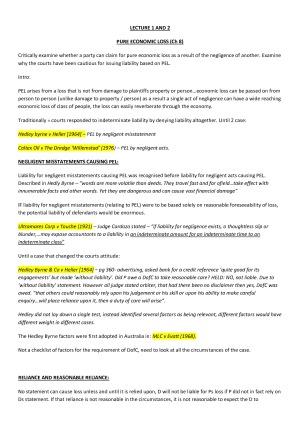 Very detailed and clear notes, each section has case summary and key points plus an overall conclusion of the main issues. the notes include the page markers from the main text book and mock exam answers. HD student. units covered: Pure economic loss, mental harm, trespass to land, trespass to person, defamation, Nuisance, Vicarious Liability, other special duty and mock exam (scored HD)