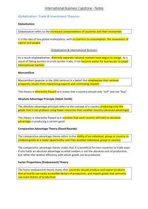 These International Business Capstone (21506) notes are in-depth, concise and to the point. I used these notes for the final exam, and did very well! The notes have been double checked and have no mistakes. They are perfectly formatted and will greatly help you with the subject! Topic list: Globalization: Trade & Investment Theories Global Market Opportunities International Market Entry Strategies Semi-Globalization & Trade Agreements Entrepreneurship & Base of the Pyramid Culture, Communication & Negotiations International Human Resource Management Knowledge Transfer & Trade in Services Emerging Issues in International Business